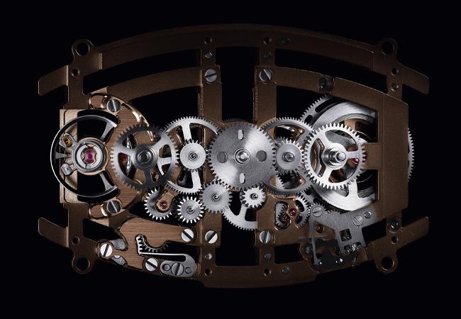 從鏤空的面盤看去,可見到其所搭載的9919 MC手上鍊機芯,齒輪輪系排為一直列,且全都縮在6點到12點之間的狹長位置,甚至為了同樣擁有彎曲弧度,還使整體齒輪在發條盒和擒縱輪上彎曲。最厲害的是,其更直接連動兩個時區裝置,這所有設置都妥善地收納進酒桶形的錶殼中。其功能上有所出彩,錶殼造型帶來的曲線美感也分毫不減,可說是在複雜與設計間做了最好的平衡,既不過分張揚,也顯露出品牌製錶實力。細看面盤,可見明顯分成了上下兩部分。