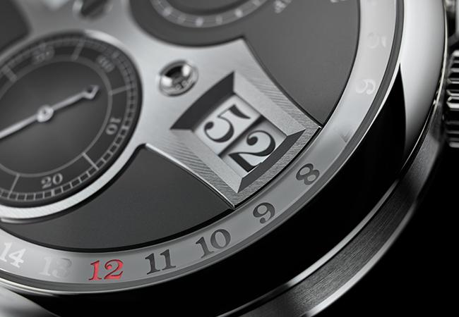 直到十年之後,朗格才在Zeitwerk Date增添此項功能。但是為了避免影響面盤的美觀性,朗格選擇使用環形日期盤的設計,這與先前朗格在Lange 1陀飛輪萬年曆中所使用的環形月份盤有同工異曲之妙。不過,日期是每天都在變換,必須更為清晰易讀,所以廠方採用玻璃打造環形日期盤,以紅色指示當天日期;但其實日期盤本身並不會轉動,而是透過下方的色塊環在午夜時分向前跳動一格,經過一個月之後,便會環繞面盤外緣一周。透過這樣的設計,便能在不影響面盤佈局與機芯結構的情況下,達成最佳的閱讀效果;使用者可透過錶殼八點鐘位置的按把,快速調整日期,每按壓一次,會在鬆開時產生切換動力,往前跳動一日。Zeitwerk Date除了具有全新的日期指示功能之外,過Zeitwerk調整時間都必須仰賴錶冠從分鐘開始調整,雖然不需要花費太多時間,但如果有更快速的方法,肯定更能滿足使用者的需求。
