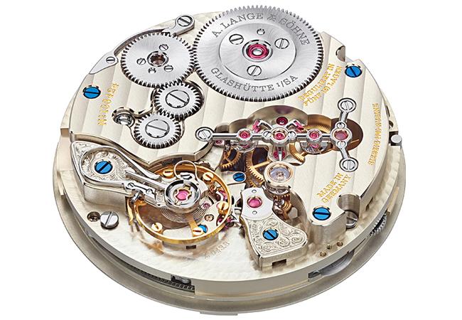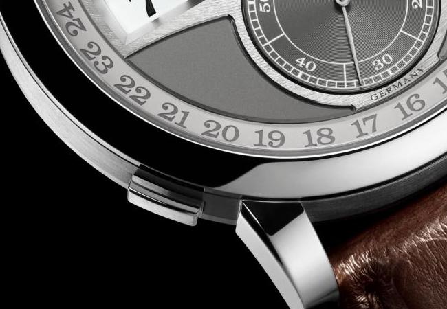 因此,朗格的製錶師設計可單獨調整小時視窗的方式,也就是利用按壓四點鐘位置的按把,便可快速推進一小時。不過實際操作按把時,會發現視窗內的小時數字在按壓時並不會跳動,只有在鬆開按把時才會,與八點鐘位置的日期快調按把相同。根據朗格製錶師的研究,在操作按把的瞬間,力量往往會不均等;為了避免過強的衝擊力造成零件損壞,廠方特別設計一組離合零件,讓按把在鬆開時才會撥動內部的零件,此力量是來自內部的簧片零件,因此每一次的操作,都能確保零件端是接收到恆定的力量,同時減少遭受意外碰撞時的損壞。