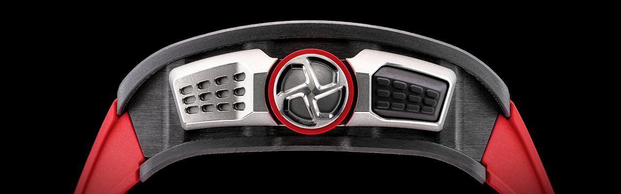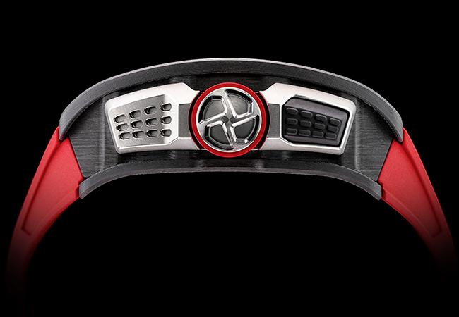 RM70-01機芯的基板與夾板採用特殊的五級鈦合金製造,這項合金以90%的五級鈦、6%的鋁與4%的釩組成,不僅比銅合金更為輕盈堅固之外,同時還擁有抗腐蝕等特性,是目前品牌旗下錶款最常使用的機芯材質;其表面使用黑色PVD處理之外,夾板的倒角也經過細膩拋光處理。相較於以往RICHARD MILLE所常用的酒桶型、圓型或方形錶款,RM 70-01採用不對稱錶殼,是過去品牌錶款未曾出現的樣貌,但透過廠方設計的特殊線條,配戴在腕上,可說是擁有絕佳的舒適感受。