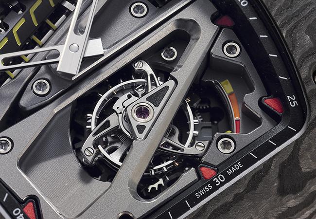 過去為了避免增加機芯的厚度與複雜性,幾乎沒有機芯會將擺輪或陀飛輪重疊在發條盒上,但由於錶款的特殊結構,因此走時輪系必須轉個大彎,讓出上方的空間。而機芯的調時輪系、動力儲存輪系與上鍊的大小捲車齒輪,則集中在錶冠與發條盒之間的空間;面盤五點鐘的位置,則具有動力儲存顯示,由黃、橘、紅三色代表動力儲存高至低的狀態,黃色指針標示動力儲存的多寡,發條盒上滿鍊之後,具有70小時的動力儲存。此外,錶款的機芯採用快速旋轉的發條盒(轉動一周需6小時而非7.5小時),具有完美的能量釋放曲線;而特殊的漸進反彈功能發條盒轉桿,在開始上鍊時節省相當可觀的能量(約20%),同時有助於平均分配主發條的內部張力。