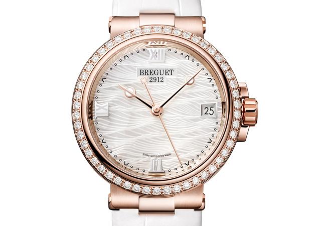 寶璣為Marine女錶開發了全新波浪紋飾的機刻雕花,珍珠母貝面盤本身就會隨著光影改變色澤,與波浪紋的機刻雕花相襯,更能反映出光影的流動感。珍珠母貝雖然較金屬軟,但也容易破裂,機雕時須更小心。33.8mm/18K玫瑰金/參考價NTD 1,123,000