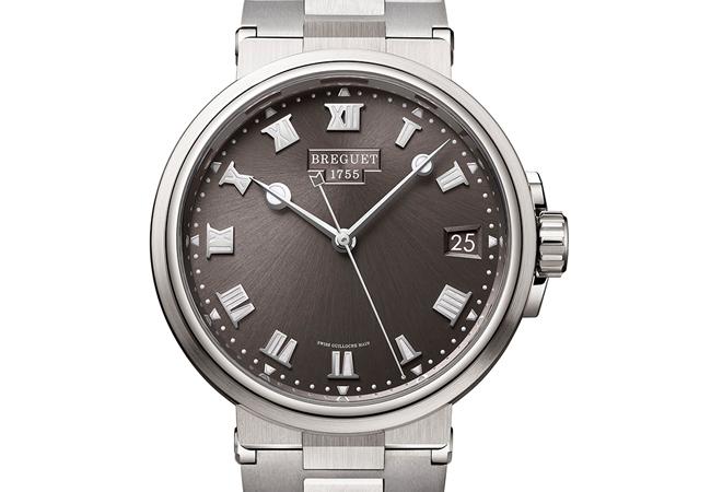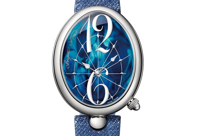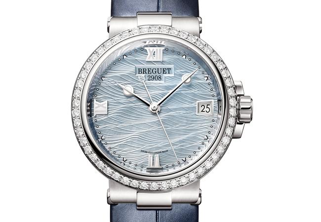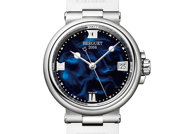 新款Marine推出後很受好評,今年乘勝追擊,推出女裝版本,白金、玫瑰金或不鏽鋼材質、珍珠母貝或藍漆面盤、皮帶或橡膠錶帶、錶圈是否鑲鑽等等,有多種不同的型號,可見寶璣對女錶市場的重視。特別是藍漆面盤的製作方式前所未有,每一個面盤都由匠師以手工混調濃、淡藍漆,所以每個都是獨一無二。這種面盤也營造出迷幻的視覺效果。33.8mm/不鏽鋼/參考價NTD 644,000