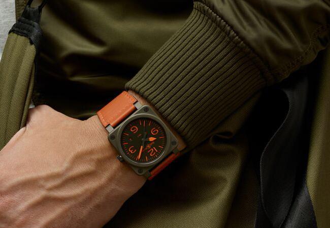 BR 03-92 MA-1的靈感是MA-1外套而非尼龍,但跟尼龍同樣輕巧又防刮花的陶瓷物料則應用於深卡其色錶殼,加上深卡其色錶盤,對比下為夜間飛行而設的橙色夜光數字更覺搶眼。製作錶殼的原料氧化陶瓷粉尚未結晶就加入特別顏料,令錶殼呈現深綠卡其色。錶盤由兩塊金屬片重疊成三文治式結構,上面一塊的數字及時標位置鏤通,露出下層金屬片的夜光塗層。鮮橙色及深卡其色一直是常見的軍事顏色組合:深綠色在極端環境中起保護色作用,而橙色一直為航空界採用,時至今天飛機駕駛艙仍然以橙色標示重要及緊急指令,而飛機駕駛艙與Bell & Ross的淵源亦不用贅言。BR 03-92 MA-1的卡其/橙色小牛皮錶帶可以隨時雙面佩戴,跟MA-1外套雙面設計呼應,深卡其色一面的縫線襯色如隱形,只有在橙色一面顯出對比,這細微設計心思就只有錶主知曉。這新作的匠心設計一一於42毫米的錶身中亮相,就像受人膜拜的MA-1飛行外套一樣,無論是復古飛行錶迷或時尚份子都會為之著迷。