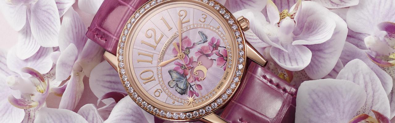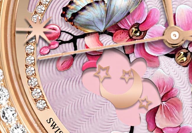 工匠大師在微光閃耀的背景上,逐筆勾勒由蘭花和蝴蝶組成的細膩構圖,栩栩如生。每一件微繪作品均細緻逼真、深邃細緻,而且有著微小的差異,蘊含工匠的個性和熱忱。精緻的橢圓形鑽石環圈讓微繪圖案更為令人矚目,繁花之中設有一枚花朵形狀的視窗作為晝/夜顯示。錶盤邊緣鑲嵌的精緻金色星星用於標記指示特定的約會時間,可透過第二枚錶冠調整位置。當設定的時間到來,腕錶會奏響清脆悅耳的優美樂韻,提醒佩戴者及時赴約。這款腕錶以富有詩意而妙想天開方式展現溫婉嫵媚的女性特質,彰顯積家的非凡精湛技藝。