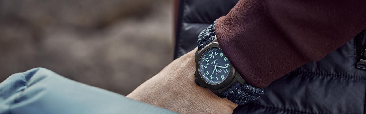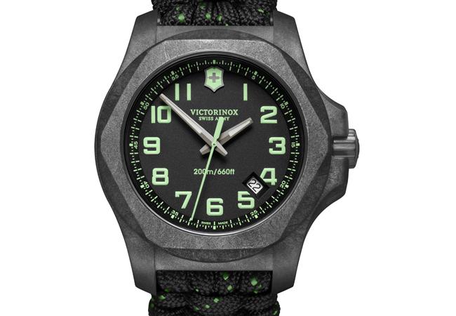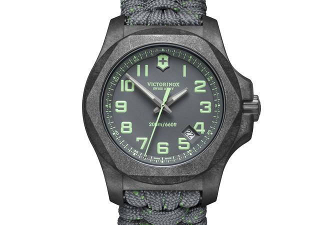 錶帶採用的傘繩物料以往只用於製作降落傘的傘繩,斷裂強度為 250 公斤,以多條尼龍繩製作而成,可應付各種活動。錶帶有黑色、藍色、灰色可選,而綠色飾條可完美配搭錶盤,高效能之餘亦不失風格。I.N.O.X. Carbon 為現今的都市探險家帶來時尚質感,將 Victorinox 的開拓精神融合至高科技及前衛創新的設計之中。