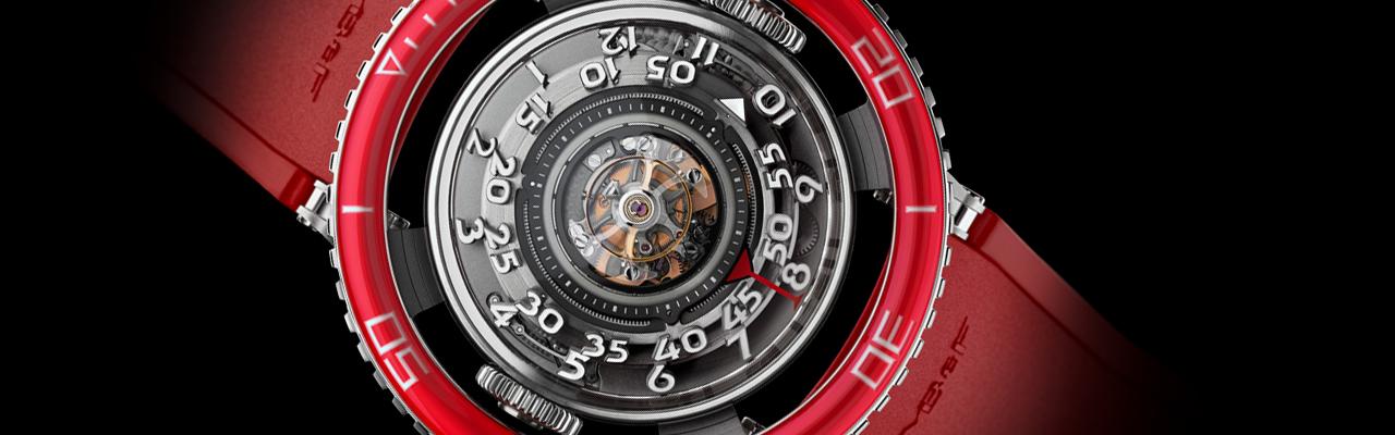 此中心式結構可讓小時與分鐘繞著機芯圓周顯示,然而,這卻使結構本身面臨一大挑戰:要如何支撐這樣的大錶徑顯示環且不影響機芯的計時效能? 答案就是研發出超大錶徑陶瓷滾珠軸承,藉以支撐球形造型的小時與分鐘顯示,並以低摩擦係數進行旋轉。球形圓盤採鈦金屬材質製成,藉此達到輕量化設計同時兼顧耐用剛性。