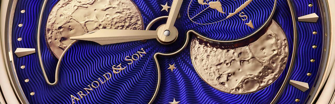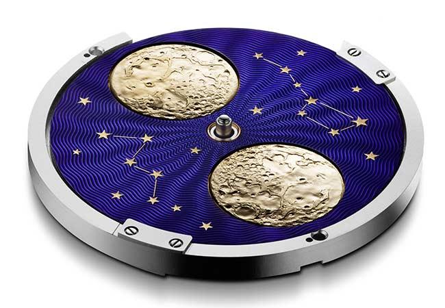 兩個金色的月亮是按照手工雕刻出來的原型複製而成的,如月球表面般的凹凸起伏令人玩味。面盤與月相盤都在紐索紋上覆以半透明的藍漆,營造出湛藍夜空的氛圍,亞諾錶還特別將容易辨識的北斗七星與W形的仙后座標示出來,星空、明月更添美感。