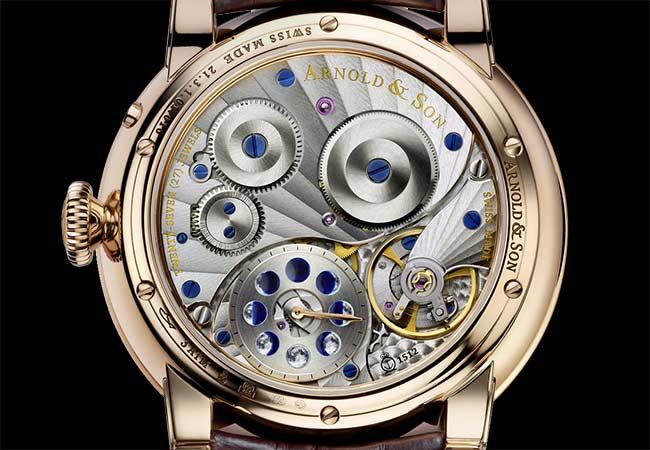 經過手工修飾打磨的A&S 1512手動機芯相當漂亮,它的機板是以俗稱德國銀的鎳銀製作而成,鎳銀硬度較一般機芯所使用的黃銅材質高,加工比較困難,只有少數高級機芯才會使用。亞諾錶還為機芯鍍上貴金屬銠,除了美觀之外,也能防止氧化。