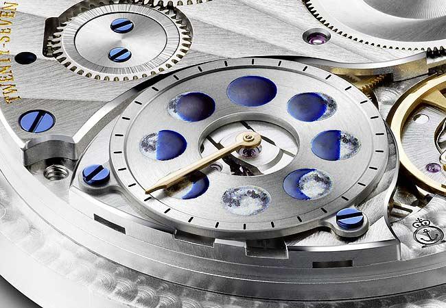 為了不讓夜空面盤上有太多視覺干擾,亞諾錶沒有在面盤上標出月相的刻度,巧妙的是,這款錶也沒有犧牲精準調校月相的功能。在腕錶背面,可以看到機芯上還有一個指針式的月相顯示,這個月相盤的周圍就有標示刻度,便於調校。在感性地營造浪漫星空明月之時,亞諾錶仍考量到對於精準的理性要求。