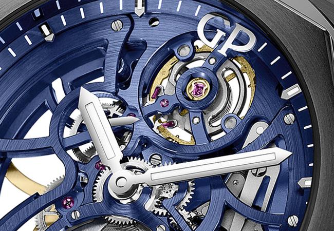 每一處都展現對優美比例和人體工學的追求。腕錶內部可見GP芝柏錶於瑞士拉紹德封(La Chaux-de-Fonds)的工廠研發、製作和組裝的GP01800-1041機芯。這枚機芯完全以手工方式做鏤空及修飾,打磨出角度加強輪廓和內角。完全鏤空的玫瑰金擺陀襯托出機械雕花的紋理,即使最微弱的光線也能捕捉。在優雅的藍色鏤空花紋之中,核心於正午時分跳動。平衡擺輪提醒人們Laureato Skeleton桂冠系列「天際行者」鏤空腕錶的生命力,透過變數慣性設計實現優異的精準度。