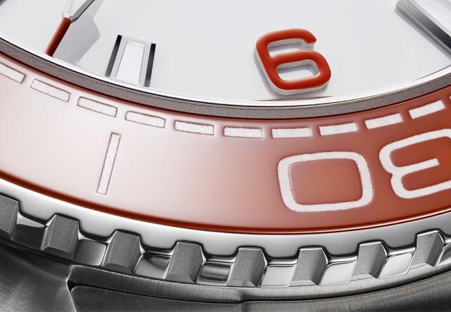 就整個SWATCH集團來說,歐米茄OMEGA可算是最具冒險精神的品牌,集團擁有完整產業鍊,包括結構研發、材質研發有不同於許多品牌的優勢,而歐米茄也在這得天獨厚的環境下不斷進化。這邊要說的是今年全新推出的Planet Ocean海馬潛水腕錶。系列從2005年推出,考量到水下辨識度所設計的橘色錶圈,成就系列的主要形象。而今年歐米茄回歸原點,重回橘色Planet Ocean。採用全新研發,以二氧化鋯為基礎的橘色陶瓷錶圈。陶瓷成色主要是透過原料中所含礦物的變化而來,因此成分稍有差池可能也會造成顏色的偏差。這次歐米茄成功完成橘色陶瓷,也正積極申請特殊製程的專利中。另外,錶款面盤也是白色陶瓷材質。