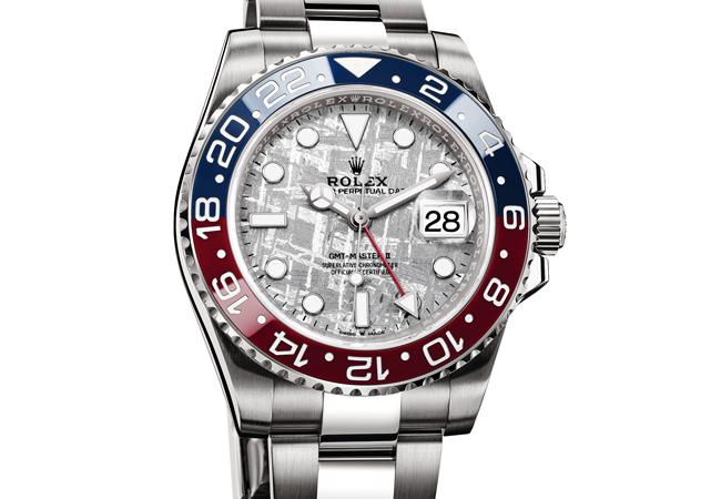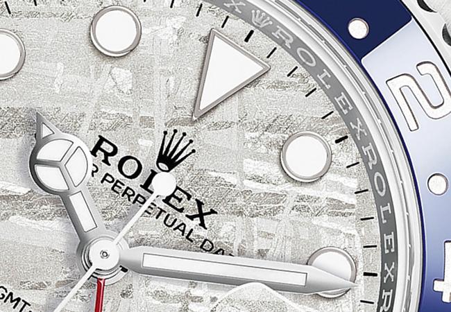 人類與隕石的淵源極久,但何時?又是誰最早發想用於腕錶上?這樁公案如今也無需刻意考察,但是大致同意是在兩千年前後出現,而勞力士ROLEX的Daytona則是最早使用此一材質的品牌錶款之一。之後品牌也陸續(沒大張旗鼓的)推出隕石面盤錶款。今年則首度用於GMT Master II 126719BLRO上,此外,還搭配紅藍可樂圈,錶款才在曝光,便引來錶迷傳唱。隕石依質地區分有許多種,例如石隕石、玻璃隕石、鐵隕石等,而目前用於腕錶面盤的多是以鐵鎳為主成份構成的鐵隕石。由於來自天外,且可能經過百萬年的淬煉凝結,數量與產地都稀少,價格居高不下也是理所當然。