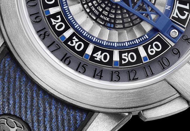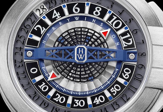 海瑞溫斯頓HARRY WINSTON的Project Z系列常可見到偏心顯示的設計特徵,這款Project Z12腕錶倒是很不一樣,它以多重同心圓的交疊結構展現平衡視覺,最特別的是其以同軸雙指針來指示小時、分鐘的雙逆跳功能,這在錶壇上是相當少見的配置。Project Z12腕錶以相當有趣的方式來表現時間。首先,小時、分鐘由腕錶上半部和下半部的扇形環來顯示。下方可見0至60數字時標,紅色三角指針每到60即會逆跳回到原點;與此同時,上方的紅色三角指針也會往前遞進一格,指示1至12整點,到了12點也逆跳回原點。