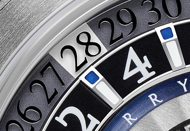 細心觀察,可發現此雙逆跳機制的兩根指針以同軸心設計,這樣的方式提高了機芯的製作難度,在錶壇上並不多見,尤其每根指針還必須逆跳回將近180度的大幅度,這種種都體現出其背後所隱含的精湛製錶技術。而相當巧妙地,兩個逆跳機制正好組合成一個完整的圓型,這為整體均衡的視覺形象,也帶入了點過去偏心設計所具備的不對稱感覺。此錶另一個特色之處,在於日期指示。與一般使用日期窗來讀時不同,在這裡相應同心圓結構,日期功能以面盤最外圍的數字環呈現。