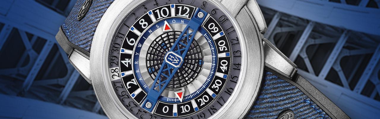 當日期往前,數字環下方的螢光材質盤面便會移動,以指示出相應的日期。在面盤之上,所有功能以圓弧組合在一起,如漣漪般遞進,不僅有別於一般的讀時方式,很有別樣樂趣,其展現出的視覺美感也相當迷人。為了讓腕錶在視覺上更為和諧美化,在面盤裝飾上也下了許多功夫。成為視覺焦點的,就是位於面盤中央,橫跨左右兩側的大型拱型錶橋。這個拱形錶橋以鋼樑造型做設計,在呼應紐約曼哈頓大橋的結構,注入品牌背景色彩之餘;也分隔開上下兩部分的時、分顯示,令辨讀更加容易。在此錶橋下方,還可見到黑色網狀的圓形盤和面盤上的放射狀波紋等裝飾,與錶橋一同強化了整個面盤的重心,也增加細節上的美感層次。