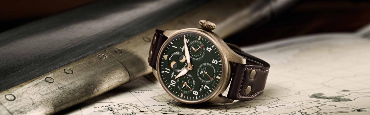萬國錶IWC在2019年推出全新的飛行員系列腕錶,其中的噴火戰機大型飛行員萬年曆腕錶雖然並不是新面孔, 但是廠方改用青銅材質搭配橄欖綠面盤,不僅整體風格為之一變,更成為錶壇上的首款青銅萬年曆腕錶。2019年萬國錶IWC推出飛行員系列的改款作品,但因為距離上次改款時間,僅有短短的三年(2016年),所以此次的改款則著重在TOP GUN與噴火戰機這兩個子系列中,但是噴火戰機系列中的青銅錶款比例卻是創下新高。其中,噴火戰機系列,更是首次推出青銅材質的大型飛行員萬年曆腕錶,成為錶壇中少見的青銅材質+複雜功能的新組合。回顧過去,當沛納海PANERAI在2011年首次推出青銅材質的Luminor Submersible 1950 錶款之後(PAM00382),便掀起青銅材質的熱潮。