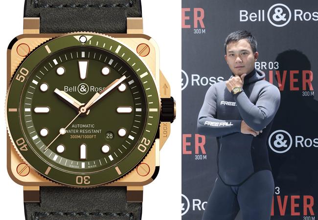 曾經帶領鍾瑶探索技術潛水的台灣選手盧宏洋在環太平洋自由潛水泳池賽以173米刷新動態有蹼平潛(DYN)的男子國家紀錄,並在泛太平洋自由潛水室內賽中以167米的成績二刷國家記錄,成為DNF與DYN兩項台灣記錄保持人,搶先配戴Bell & Ross 2019全新上市BR03-92 Diver Green Bronze,在發表會中展現精湛自由潛水技巧,眼神堅定地分享最新目標,在CWT有蹼恆重下潛有75米的個人最佳記錄的他,今年將開始規劃深度訓練,希望能突破自我極限,創造個人佳績。分享自潛體驗說道:「在挑戰深海下潛時,深度超過50米後胸腔壓力會明顯增大,海下的能見度也會越來越低,需盡可能保持放鬆及專注平壓,還要克服強大的生理與心理壓力,潛水不僅是探索海洋世界的方式,也是了解自己的途徑,在獨處的狀態下面對極限環境的挑戰,承受海底帶來的壓力。」