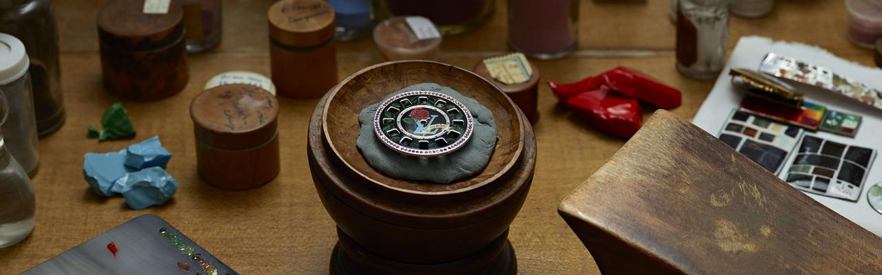 錶盤以白K金銘板為底,先以手工鑿凹,再填入大明火琺瑯。黑色、藍綠色、和透明琺瑯併用的目的為凸顯花朵設計。精選琺瑯粉末,層層反覆塗抹,再加上顆粒非常細緻,因此工匠需要投入許多小時,才能以攝氏840度高溫窯燒錶盤。下一步就是微型彩繪,工匠用畫筆繪上約十種顏色,完成一種顏色都要放入窯中以攝氏100度烤乾。在鑲嵌白鑽和紅寶石的精美錶盤上,18K白金指針設計構成玫瑰錶盤的葉柄。鈦金屬和白K金製錶圈、錶耳、41毫米直徑錶殼和錶冠均鑲嵌白鑽,搭配精緻美麗的錶盤。