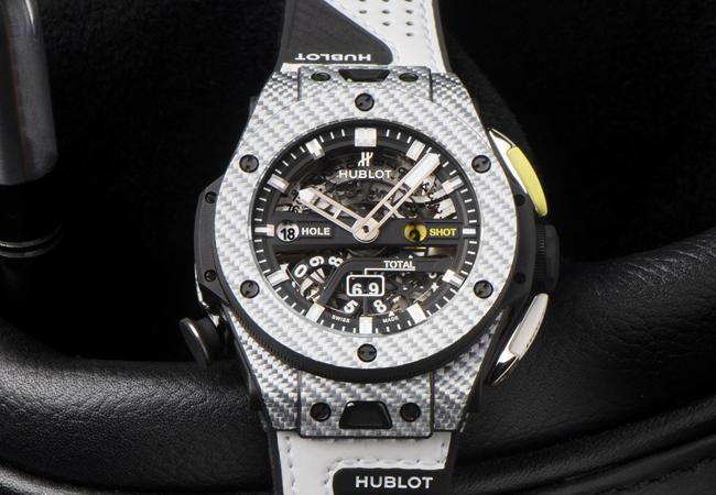 Big Bang Unico Golf高爾夫腕錶是全球首創的機械式高爾夫球腕錶,功能齊全,易於閱讀!整只錶僅重97.93公克,輕盈的秘訣在於錶殼採用鍍鋁碳纖維(Texalium®)打造而成;這是由宇舶獨家研發的創新材質技術,將碳纖維與鋁金屬結合為一,兼具兩者的質地與特性,賦與腕錶輕盈的質量。配有兩條替換錶帶,一條是皮革與橡膠複合錶帶,造型設計宛如高爾夫球手套,另一條是高科技纖維搭配魔鬼氈確,確保腕錶能完美服貼於手腕。
