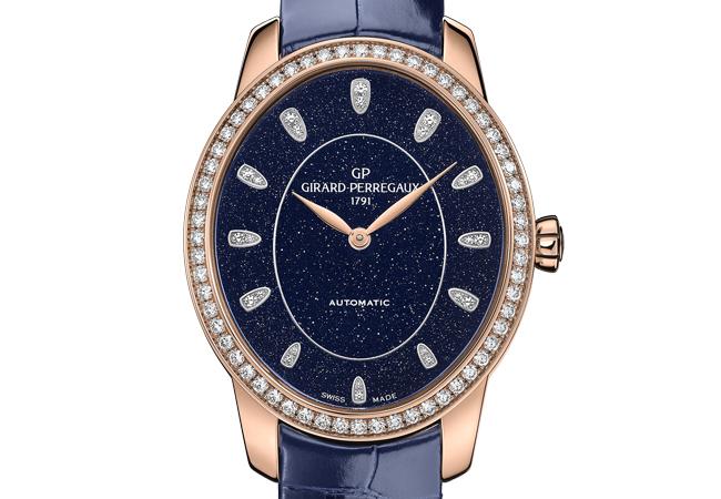貓眼系列 Majestic腕表採用縱向橢圓形設計,柔美線條沿著表耳輪廓向兩端流淌內收。玫瑰金表殼上嵌60顆明亮式切割鑽石,彰顯魅惑表盤的尊貴質感,邀您掬一捧清美夜色。誘人的藍黑色更顯神秘,內部的閃爍金粉營造出一簇悠遠而璀璨的星雲。24枚水滴狀鑽石裝飾於橢圓形玫瑰金時標環上,與橢圓形表盤相得益彰,綻放夢幻詩意。