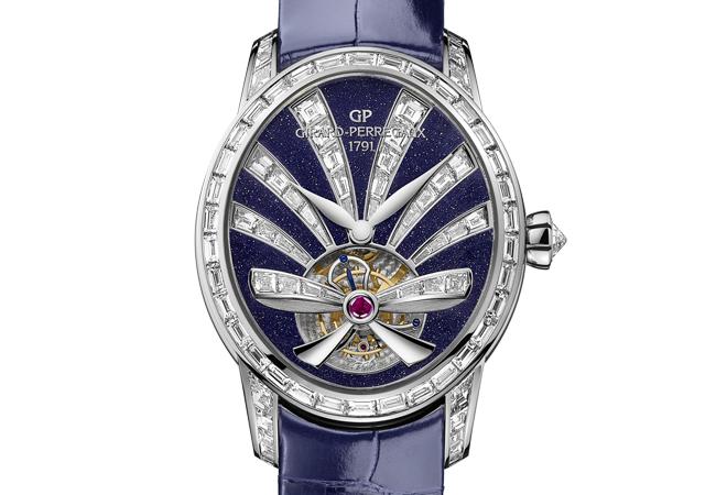 夜藍色表盤演繹著一片浩瀚天空之唯美,點綴其中的多顆梯型切割鑽石勾聯起來形成的軌跡令人聯想到在流星雨許願的情景。梯型切割鑽石沿表圈有序排列,似一股靈動的流水湧向精巧修長的表耳位置。抵消引力的七弦琴形狀陀飛輪映襯腕表上的6.20克拉鑽石,包括鑲嵌在花式表冠上的一顆玫瑰式切割鑽石。