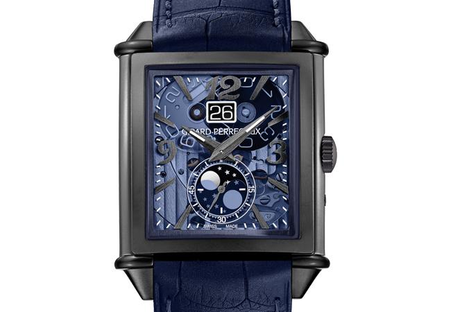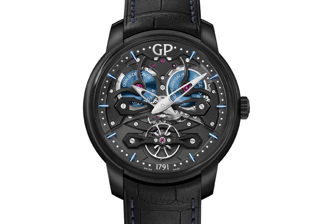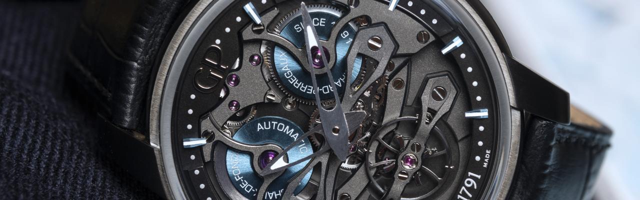 Neo Bridges天際行者腕表精妙地融合傳統和創新,將150多年前的機芯結構以靈活生動的方式重新演繹。此機械裝置一直與時並進,來到今天更晉身GP芝柏表經典代表作之列。今年,作為「天際行者」主題的一部分,該裝置再次以鈦金屬材質亮相,45毫米表殼更選用黑色DLC塗層。當代修飾工藝突顯機芯結構的建構風格,例如發條盒蓋及微型擺輪均添上藍色PVD鍍層,而呈微妙曲線的橋板和夾板橋則經過黑色PVD鍍層工藝處理。