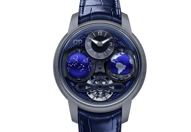 COSMOS腕表上雙球體的對稱佈局是對秩序與美學的探究體現。這個表款來自標誌性的金橋系列,結合置於黑色鈦金屬搭橋下的陀飛輪、地球日夜顯示器、天空圖,以及世界時間的複雜功能,是浪漫與機械的完美結合。腕表配備品牌自行研發的全新GP09320-1098機芯,機芯有力跳動,促使COSMOS這個「宇宙」精準的在軌道上運轉。十二星座以液體夜光元素突出顯示,從而令COSMOS腕表即使在漆黑暗夜也能履行它的天文職責。另外,一個球體巧妙地將這個於正午時肉眼不可見的星座顯示於表盤上,而將在午夜時肉眼可見的星座顯示於表背。COSMOS腕表提供了兩種視角的演繹:從地球表面見到的星際空間,以及身處地球大氣層所看到的蔚藍地球。這種雙重性體現於COSMOS腕表的亮光特性。其夜晚一面與其白天一面截然不同。群星璀璨的夜色美景在黑暗中灼灼閃光,承載了深刻內涵,如此機械裝置成就如斯耀眼奪目的夜色,讓人難以置信。