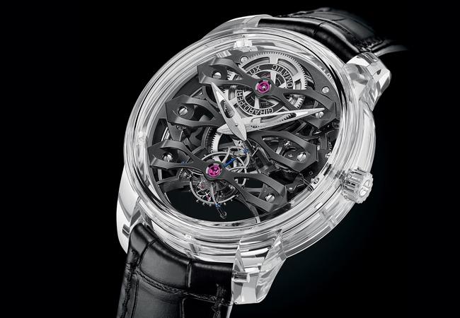 光明與黑暗的矛盾組合,正正是GP芝柏表Quasar腕表的真實寫照。Quasar意為「類星體」,即圍繞在星系中心黑洞的那片異常明亮的區域。這款表殼今年於美國邁阿密2019年「鐘表與奇跡」 (Watches & Wonders) 高級鐘表展上發佈,透明藍寶石水晶玻璃表殼把陀飛輪機芯複雜精緻的內部結構展現得淋漓盡致,把近乎無重的GP9400-1035機芯的鏤空結構得以完美展現,好比從望遠鏡中欣賞到的星星——清晰細膩,鮮活靈動。