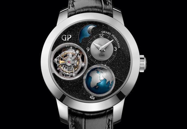對抗引力150年的GP 芝柏表再次彰顯其成熟的高精準機芯。人手打磨的黑色砂金石表盤宛如一幅星際畫布,包圍著製表業界極少有的三軸陀飛輪,其獨特的七弦琴形狀自1880年代以來都是品牌陀飛輪的獨特象徵。24小時運行的球體是由人手精心繪製;精準月相顯示每隔122年才需要調校一次。