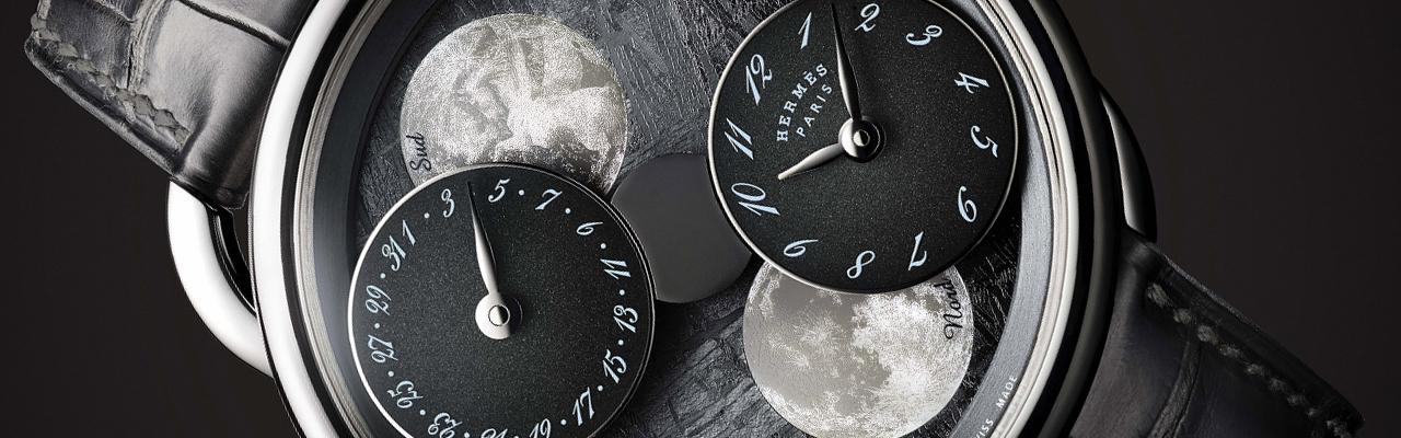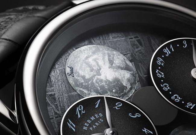 這神秘的捉迷藏遊戲讓人無法一眼揭露其背後所潛藏的精密複雜技術,然而卻能令人擁有無止境的夢想空間。在此獨特的時空中,金屬、星辰及岩石融鑄成腕錶的外觀與機芯,實現了一場前所未見的技術與美學展示,呈現了簡約又極具圖像的讀時功能。在此,雙月相盤不採用傳統的視窗顯示設計,而是大方地呈現在整個錶面上,彰顯出愛馬仕對製作機械錶自由不羈的詮釋觀點。