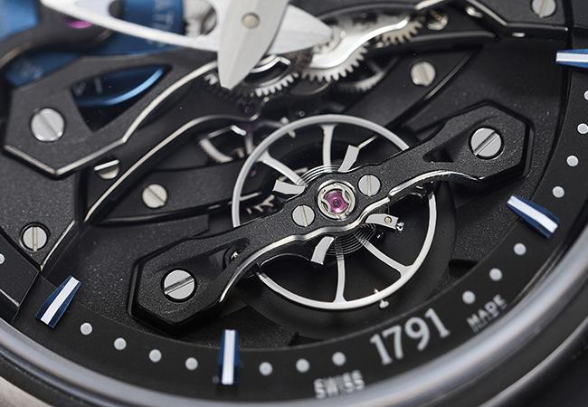 延續上一代的設計,此表同樣將發條盒縮小至2點位置、微型自動盤縮小於11點位置,左右對稱於面盤上半部,以獨特的雙眼式設計呈現。整體面盤的開面結構不僅將各處機芯零件外露出來,大展機械律動之美,在其雙眼設計的配置、上下夾板的高低錯落、鏤空零件以及懸浮時標小時環的搭配下,更營造出絕佳的立體視覺,呈現帶有層次的建築美感。而相當特別地,為了呼應今年度的宇宙主題,此表在發條盒蓋和微型自動盤零件上都覆以藍色PVD鍍層,位於面盤周圍的懸浮時標也點綴上藍色,配上以黑色DLC鍍層的鈦金屬表殼以及鍍黑夾板,整體在暗黑色調中映射出藍色光芒,真如銀河星系一般,帶出趣味十足的前衛感覺。