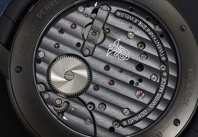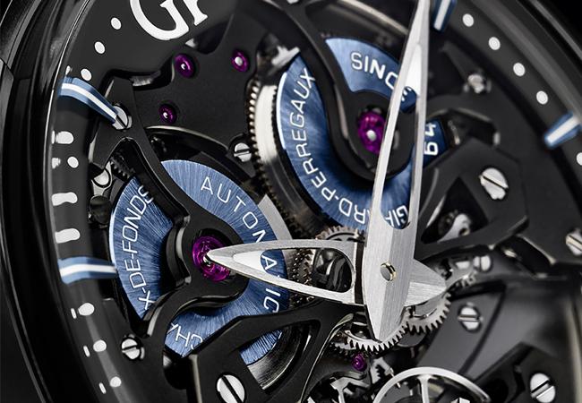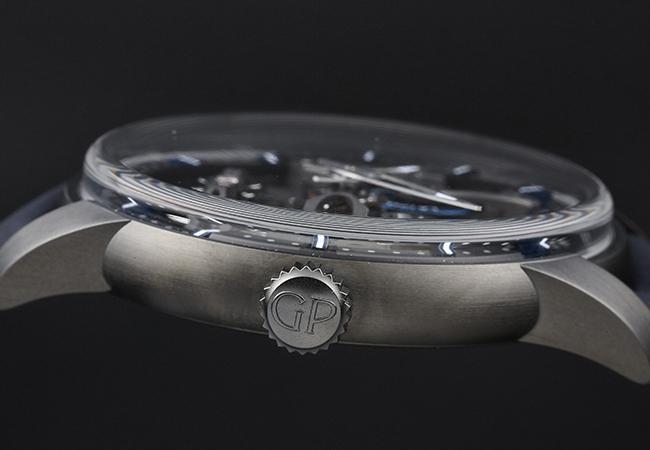 翻到表背,這次依然可以透過透明底蓋見到精緻的機芯。此表搭載機芯為GP08400-0002自動上鍊,由208個零件組合而成,具備54小時動儲。為了與腕表的暗黑色調一致,其飾有日內瓦波紋的基板表面也以黑色鍍層。其上可見寶石軸承、代表GP高品質機芯的老鷹印記。仔細端詳,在1點處的基板還可見到固定橋板,如同第三個金橋設計,與經典的三金橋相呼應。基板下方還連結了兩枚弧形橋板,遠看似一抹微笑,在設計上也頗有意思。