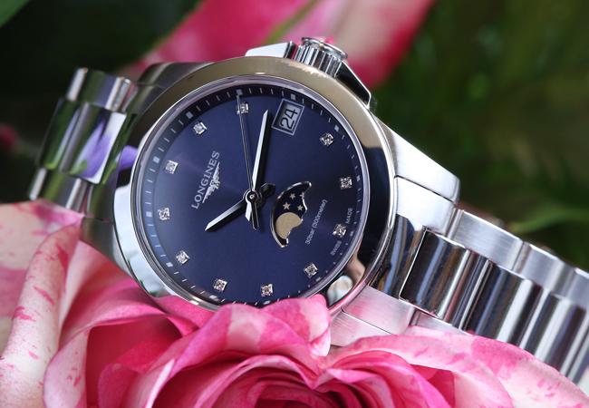 全新Longines浪琴表Conquest 征服者月相女士腕錶以藍色面盤帶來嶄新風貌,精緻的藍色半月型月相顯示設計為運動風格注入時尚率性氣息,是一款能展現活力兼具實用性能的優雅時計。全新Longines浪琴表Conquest征服者月相女士腕錶,錶徑為29.5毫米,搭載L296石英機芯與不鏽鋼錶殼與錶帶。沉靜的藍色面盤點飾著11個精緻鑽石時標。並於6點鐘位置設有藍色半月型月相顯示,讓素雅時尚的面盤更添設計巧思。
