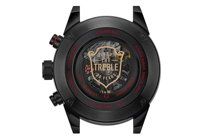 這款充滿運動風範的腕錶搭載品牌自製Heuer 01自動機芯,採用黑色蛋白石錶面,位於9點鐘的計時盤印有曼聯標誌。錶殼由黑色PVD塗層精鋼打造,搭配黑色陶瓷錶圈、米色中央秒針及時標。紅色真皮内襯橡膠錶帶飾以黑色縫線,輝映這家知名英格蘭俱樂部的鮮豔紅色。透明錶背設計將内部創新機芯的機械律動之美展露無遺,藍寶石水晶錶鏡印有盾牌標識以及米色“1999 - THE TREBLE - 20 YEARS”及“1 OF 99”字樣。