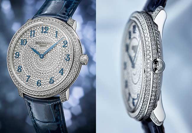 百達翡麗Diamond Ribbon用鑽石詮釋旋繞飛轉的絲帶形象,面盤上的螺旋紋裝飾是一大特色,但細節更令人驚嘆。面盤上的美鑽並不是都一樣大,而是隨著螺旋紋一起變化,中央的鑽石略小,逐漸往邊緣擴大,這樣的設計營造了絕美的視覺美感,但製作工藝卻變得非常麻煩,每顆鑽石都要按照設定的大小選擇、鑲嵌,光是挑揀的工序就很費時、費力。再細看錶圈上的鑽石是從內緣12時位置開始鑲嵌,與面盤上螺旋絲帶的形象相呼應。全錶用了770顆美鑽,總重約4.4克拉。