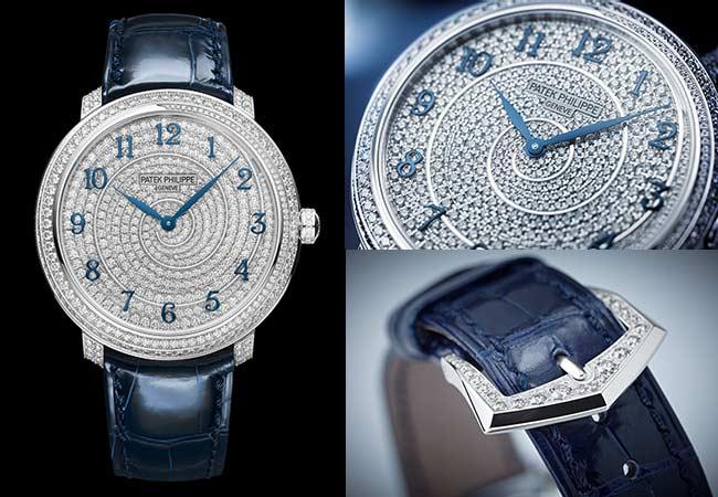 面盤上的螺旋紋是百達翡麗Diamond Ribbon的特色,設計靈感是從緞帶體操而來,為錶款帶來靈動、活潑的視覺感。面盤、錶圈、錶耳與錶扣幾乎鑲滿鑽石,全錶使用了770顆鑽石,總重約4.4克拉。這可不像一般的滿天星,只是把大小相同的鑽石鑲滿而已。仔細欣賞會發現這款4978面盤中央的鑽石最小,隨著螺旋逐漸向外,鑽石才漸次變大,整個面盤使用的各種大大小小、尺寸不同的美鑽,增加了製作的難度。而最終的視覺效果也因鑽石尺寸與螺旋變化而顯得特別生動、璀璨。