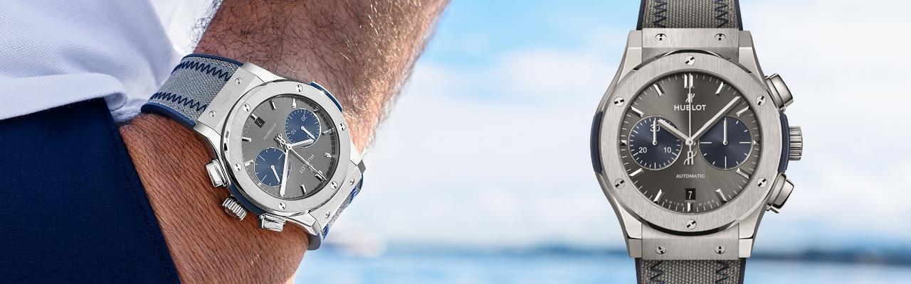 為了向這個強大而深不可測的湖泊致敬,宇舶錶以海軍藍與鋼鐵灰,融合優雅外型與蘊含強大的力量,展現Bol d'Or Mirabaud帆船賽的歷史傳統與榮耀,推出經典融合系列Bol d'Or Mirabaud2019特別版計時碼錶。以鈦金屬製成,直徑45mm,搭載HUB 1143機芯,動力儲存42小時,可陪伴選手完成賽事(史上最慢的完成賽事紀錄是31小時45分鐘)。藍色面盤採用太陽放射紋緞面處理,3點鐘與9點鐘的兩個藍色計時小錶盤則是同心圓顆粒緞面打磨。搭配藍色橡膠錶帶,結合灰色高科技纖維與藍色縫線。全球限量81只,其中一只將贈予本屆賽事冠軍。