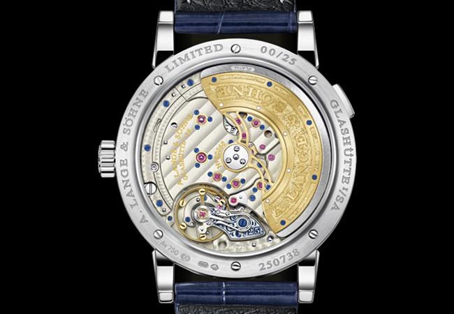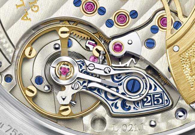 L021.1型錶廠自製自動上鍊機芯的動力儲備長達50小時。大型中置自動轉盤具外置鉑金950離心輪,為上鍊過程提供充足動力。自動轉盤在精心裝飾機芯之上方旋轉,並由此令格拉蘇蒂羅紋、鱗紋及各項修飾技術活現眼前。這個無指針的振盪系統依靠朗格擺輪游絲,透過擺輪邊緣的六個凸輪加以調校。此“25th Anniversary”錶款的手工雕刻朗格擺輪夾板亦別具一格:在著名的朗格大日曆顯示中,數字「25」採用藍色,並鐫刻了花卉圖案。