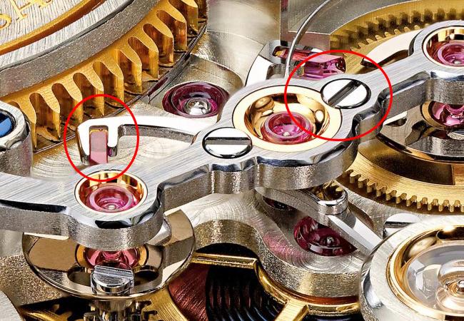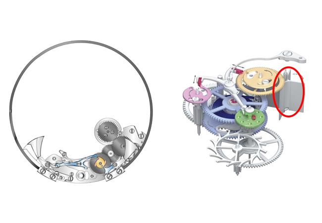 因為L043.5機芯並沒有設置傳統的報時發條盒(利用報時滑桿補充動能),而是以報時按把取代常見的報時滑桿設計,可避免拉動滑桿不完全時所造成的損害。但由於報時結構的動力依靠主發條盒,為了避免動力不足,當動力低於12小時,報時功能則無法啟動,面盤上的動力儲存顯示會以紅色標記提示。另外,機芯採用三轉盤的跳時與跳分顯示設計,因此報時結構有別於傳統三問錶;原先位於機芯中央的三個蝸形輪,必須轉移到跳時碟盤與跳分碟盤下方,其中小巧的小時蝸形輪,成為固定於小時碟盤下的大型環狀齒輪,外型結構有了明顯的差異。