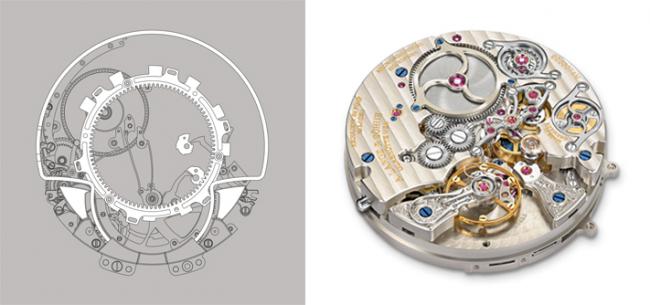 錶款內部所搭載的L043.2機芯,基礎來自於L043.1機芯,其機械設計為自鳴輪系提供理想的條件;因為當數字盤向前運轉時,發條瞬間釋放的力量,也可成為報時裝置的動力,用來拉緊彈簧,驅動兩個音槌。但由於新增自動鳴響報時功能,因此機芯的直徑擴大至36mm,而厚度也增加至10mm。