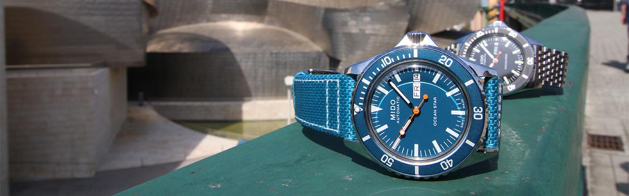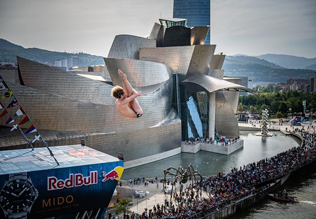 就在西班牙畢爾包,我坐在古根漢美術館旁,微微瞧了一下我手上戴著、近似土耳其藍的美度表海洋之星75週年紀念錶MIDO Ocean Star Tribute,它鮮明的盒形藍寶石鏡面、配著跟面盤顏色相同的織布錶帶,霎時間,一陣爆炸性的群眾歡呼聲衝來,把我的眼光拉回,選手從美術館旁的聖母禱詞橋(Puente de la Salve)一躍而下衝入河中,激起水花波瀾,我才意識到,原來,這就是性感。
