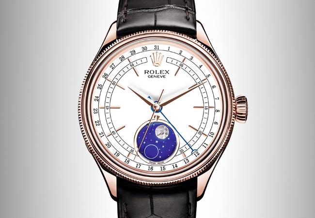 ROLEX Cellini Moonphase。斯文的徹里尼月相,以隕石代表滿月,銀環為新月的佈局,相當少見。39mm/玫瑰金錶殼/參考價NTD 888,500