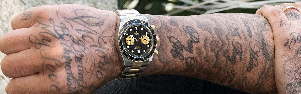 在這段影片,女神卡卡佩戴的是搭配香檳色錶面的TUDOR Black Bay 36 S&G(帝舵碧灣型36 黃金鋼款),而大衛·貝克漢佩戴的是TUDOR Black Bay Chrono S&G(帝舵碧灣計時型黃金鋼款),搭配仿古「軍錶帶」。