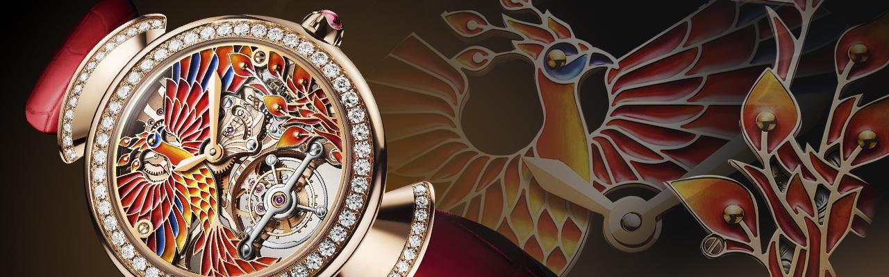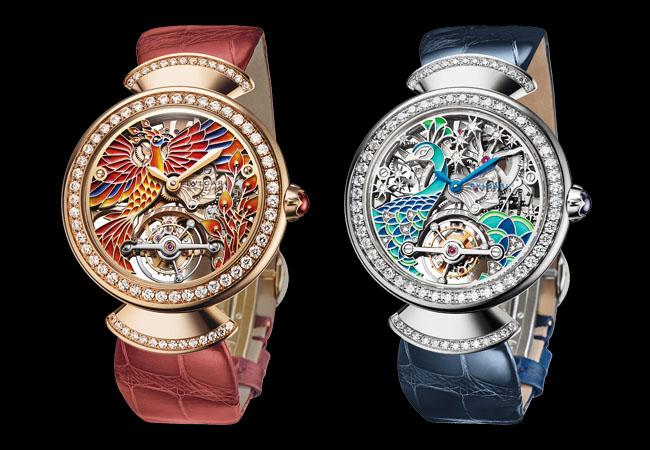 Divas' Dream系列孔雀鏤空陀飛輪女錶除了在6點鐘位置裝載提高走時精準度的陀飛輪裝置,在面盤上精雕細琢、手繪出斑斕色彩的高冷孔雀更令整只作品展現出豐富的華麗感與細膩層次,讓人印象深刻。同樣是雀鳥主題,寶格麗甚至還取材東方世界中充滿神秘色彩的鳳凰,打造出同類型設計的Divas' Dream系列鳳凰鏤空陀飛輪女錶,面盤上振翅的浴火鳳凰靈動霸氣,加上鮮豔配色更添幾分義式風格的熱情魅力,亮麗動人。