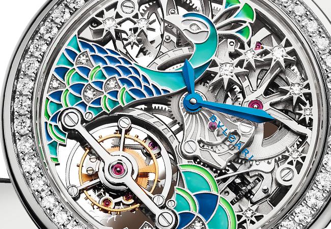2019年寶格麗推出了一只以孔雀羽毛製作面盤的Divas' Dream Peacock孔雀腕錶,斑斕色彩美不勝收,但這並非是品牌首次取材孔雀這種動物。大自然中的動物本就是工藝錶、女錶中常見的主題,而在希臘神話中,孔雀是天后希拉的聖鳥,象徵其尊貴地位和強大權力,這樣的百鳥之王放進設計中,更能將女性高貴、明豔的氣質帶入。寶格麗就曾以精湛的手工鏤雕搭配微繪工藝來呈現孔雀主題。