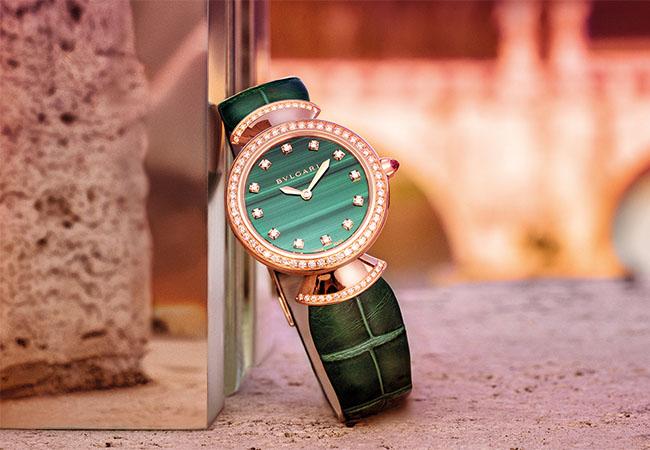 由於寶格麗在珠寶領域有著豐厚的歷史底蘊,對於各式寶石特性自然也瞭若指掌,因此其亦善於選用特殊寶石來打造作品。Divas' Dream系列孔雀石腕錶運用帶有翠綠色澤的孔雀石來製作面盤,其上的特殊紋路與深淺相間的漸變色彩交織出獨特的天然美感,賦予配戴者落落大方的活潑氣質,寶格麗在用色上的大膽靈活也由此彰顯。