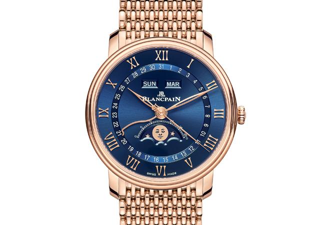 兩枚新款腕錶首次結合午夜藍色的錶盤和40毫米玫瑰金錶殼,寶藍色象徵了高貴和精緻,在陽光放射紋的錶盤飾面上顯得更深邃醉人。在這兩款Villeret腕錶的藍色錶盤上,可見纖巧的玫瑰金羅馬數字時標,時針和分針猶如鼠尾草葉片般修長柔麗,而秒針則帶有品牌創辦人Jehan-Jacques Blancpain的姓名縮寫。