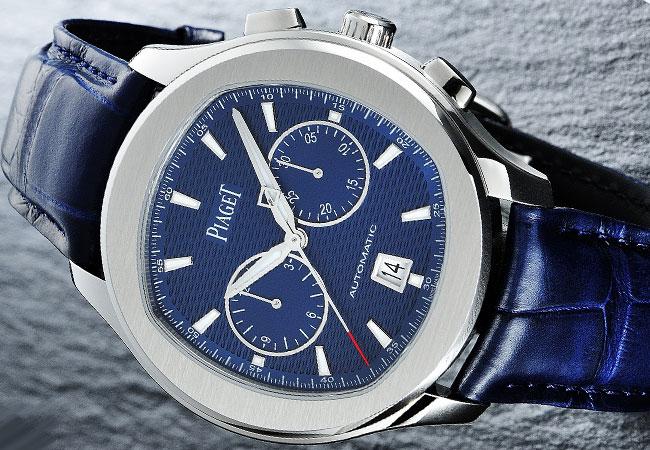 此款式為計時款,錶殼造型結合枕形和圓形,優雅極具識別度。面盤上有延續Polo系列條紋設計的橫向線條,3點和9點分別是30分鐘和12小時計時盤,而此款還使用近年流行的藍面,看起來醒目時尚。內搭機芯是品牌自製的1160P,得益於伯爵在超薄上的實力,其只有5.72mm,裝上錶殼厚度11.2mm,因此配戴感也妥貼舒適。這枚機芯同樣採用導柱輪和垂直離合結構,按壓按把的手感確實,計時秒針也不會延滯或偷跑。