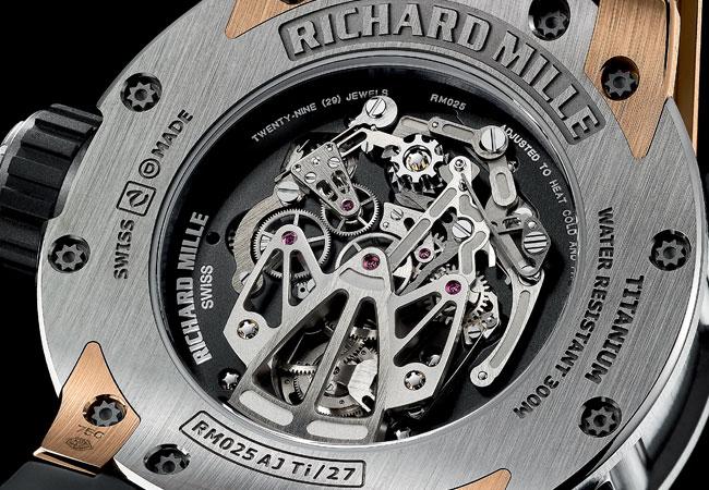 除了這些顯而易見的外觀細節,RM025機芯更是借鑒知名的RM008碳奈米纖維陀飛輪計時碼錶機芯,這枚機芯為21世紀帶來重大而獨特的新型計時碼錶概念。RM025機芯將陀飛輪和計時功能這兩項複雜功能巧妙融為一體,製作過程中又有諸多革新,例如:使用鈦合金製作導柱輪和槓桿等零件以減少慣性,並將能耗減少約50%,大幅降低中軸的摩擦,並消除計時指針在啟動和停止時的跳針和顫動現象,提升腕錶的精準度。RM025陀飛輪潛水計時碼錶的製作和組裝耗時好幾個月,僅有為數不多的製錶巧匠能夠勝任如此複雜的組裝和測試工作。因此,這款腕錶我們每年能製造出的數量相當有限。